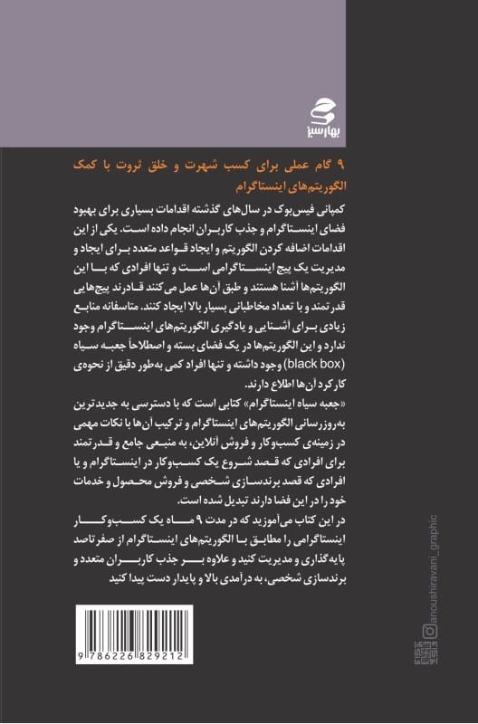 کتاب جعبه سیاه اینستاگرام کتابی است که با دسترسی به جدیدترین بهروزرسانی الگوریتمهای اینستاگرام و ترکیب آنها با نکات مهمی در زمینهی کسبوکار و فروش آنلاین، به منبعی جامع و قدرتمند برای افرادی که قصد شروع یک کسبوکار در اینستاگرام و یا افرادی که قصد برندسازی شخصی و فروش محصول و خدمات خود را در این فضا دارند تبدیل شده است.