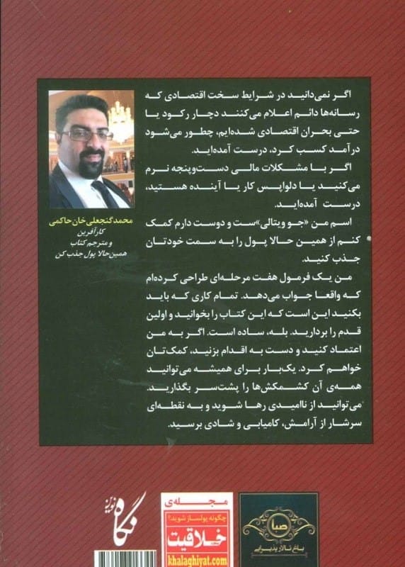 اگر نمی دانید در شرایط سخت اقتصادی که رسانه ها دائم اعلام می کنند دچار رکود یا بحران اقتصادی شده ایم، چطور می شود درآمد کسب کرد، اگر با مشکلات مالی دست و پنجه نرم می کنید یا دلواپس کار یا آینده هستید درست آمده اید. اسم من جو ویتالی است و دوست دارم کمک کنم از همین حالا پول را به سمت خودتان جذب کنید. من یک فرمول هفت مرحله ای طراحی کرده ام که واقعا جواب می دهد. تمام کاری که باید بکنید این است که کتاب همین حالا پول جذب کن را بخوانید و اولین قدم را بردارید. بله، ساده است. اگر به من اعتماد کنید و دست به اقدام بزنید، کمکتان خواهم کرد. یکبار برای همیشه می توانید آن کشمکش ها را پشت سر بگذارید. می توانید از ناامیدی ها رها شوید و به نقطه ای سرشار از آرامش، کامیابی و شادی برسید.