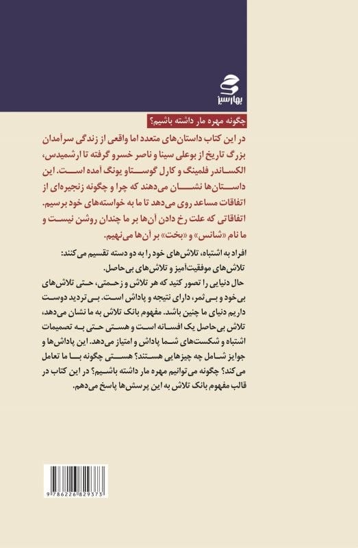 حال دنیایی را تصور کنید که هر تلاش و زحمتی، حتى تلاش های بی خود و بی ثمر، دارای نتیجه و پاداش است. بی تردید دوست داریم دنیای ما چنین باشد. مفهوم کتاب بانک تلاش به ما نشان می دهد، تلاش بی حاصل یک افسانه است و هستی حتی به تصمیمات اشتباه و شکست های شما پاداش و امتیاز می دهد. این پاداش ها و جوایز شامل چه چیزهایی هستند؟ هستی چگونه با ما تعامل می کند؟ چگونه می توانیم مهره مار داشته باشیم؟ در این کتاب در قالب مفهوم بانک تلاش به این پرسش ها پاسخ می دهم.