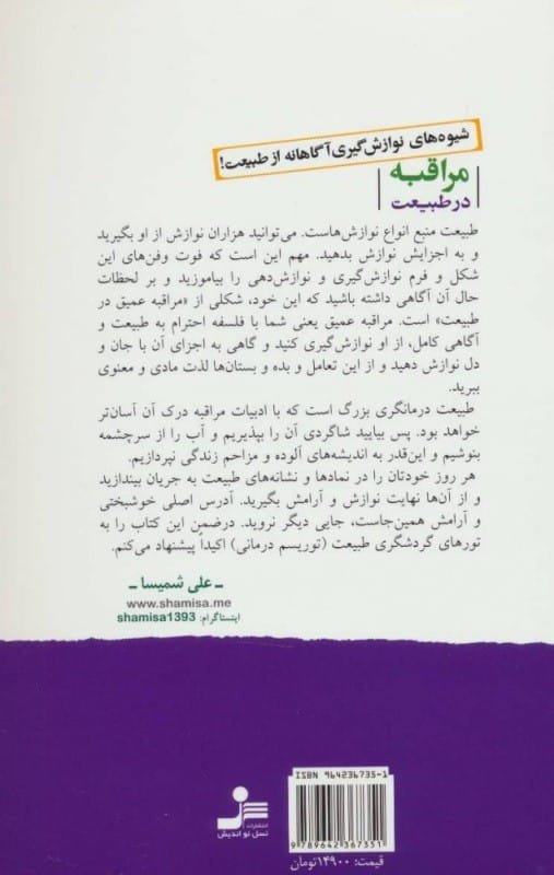 کتاب مراقبه در طبیعت نوشته ی علی شمیسا شیوه های نوازش گیری آگاهانه از طبیعت را آموزش می دهد این کتاب به همت نشر نسل نواندیش چاپ و منتشر شده است.