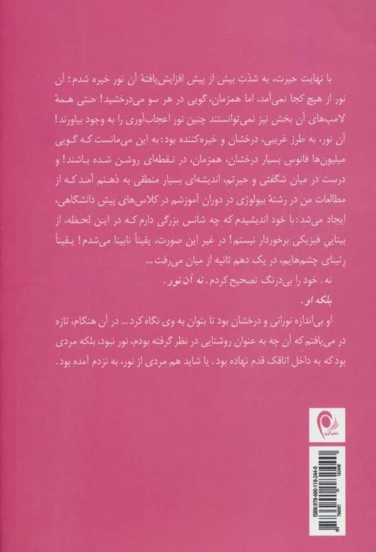 با نهایت حیرت، به شدت بیش از پیش افزایش یافته آن نور خیره شدم؛ آن نور از هیچ کجا نمی آمد، اما همزمان، گویی در هر سو می درخشید! حتی همه ی لامپهای آن بخش نیز نمی توانستند چنین نور اعجاب آوری را به وجود بیاورند! آن نور، به طرز غریبی، درخشان و خیره کننده بود: به این می مانست که گویی میلیونها فانوس بسیار درخشان، همزمان، در نقطه ای روشن شده باشند؛ و درست در میان شگفتی و حیرتم، اندیشه ای بسیار منطقی به ذهنم آمد که از مطالعات من در رشته بیولوژی در دوران آموزشم در کلاسهای پیش دانشگاهی، ایجاد می شد: با خود اندیشیدم که چه شانس بزرگی دارم که در این لحظه، از بینایی فیزیکی برخوردار نیستم! در غیر این صورت، يقينا نابینا می شدم! یقینا رتینای چشمهایم، در یک دهم ثانیه از میان می رفت …