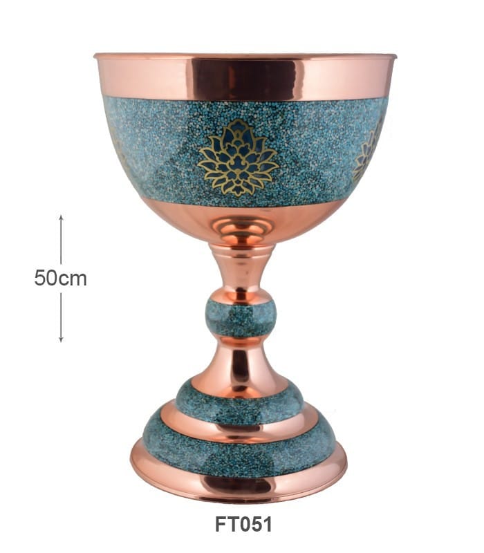 سنگاب فیروزه کوب کد FT051 بزرگترین سنگاب فیروزه کوبی شده تولید صنایع دستی آقاجانی است. در ساخت این محصول که یکی از زیباترین صنایع دستی اصفهان محسوب می شود از مس و بهترین فیروزه نیشابور استفاده شده است.
