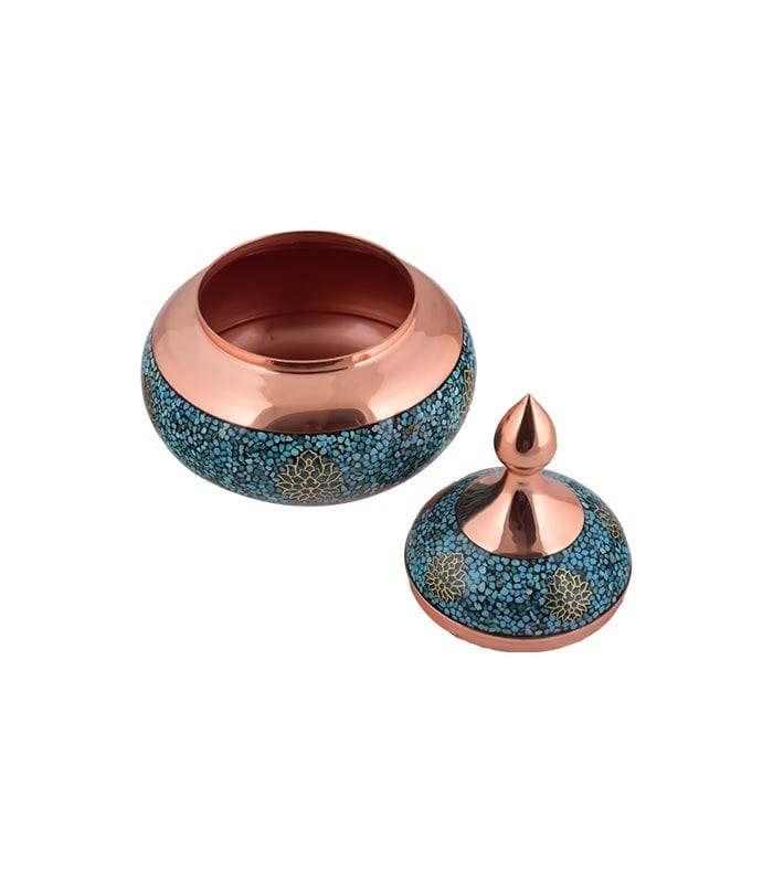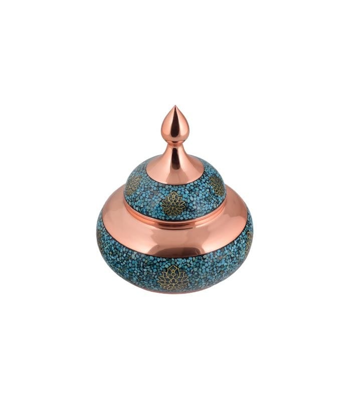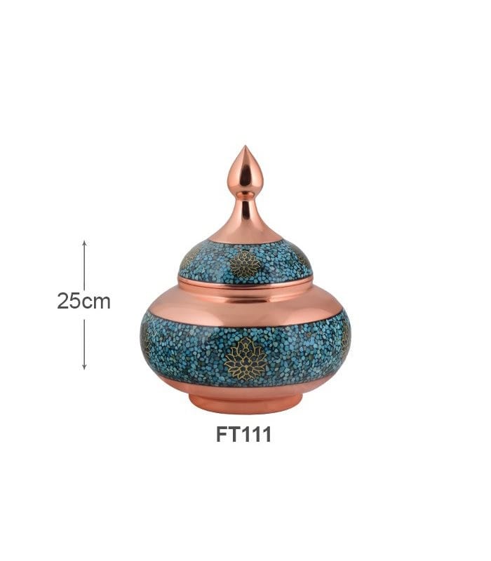قندان فیروزه کوبی ترنج کد FT111 یک قندان فیروزه کوب روی مس تولید صنایع دستی آقاجانی است که با بهترین کیفیت و قیمت توسط هنرمندان شاغل در صنایع دستی اصفهان به بهترین شکل ممکن تولید شده است. در تولید این قندان فیروزه کوبی شده با ارتفاع 25 سانتی متر، از بهترین فیروزه نیشابور استفاده گردیده است. از نکات بسیار مهم در مورد این قندان فیروزه کوب استاندارد ملی ایران و گواهینامه ISO9001 و گارانتی ضمانت 10 ساله است که به همراه این محصول ارسال می گردد.