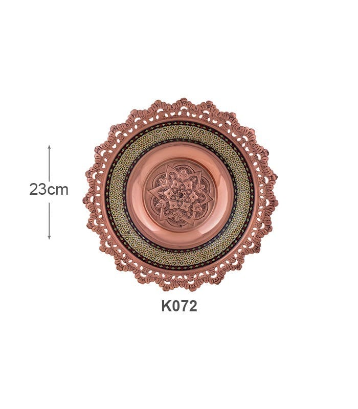 بشقاب مس و خاتم کاری کد K072 یکی از زیباترین و پرکاربردین صنایع دستی اصفهان تولید برند معتبر آقاجانی است که می تواند به میهمانی های شما رنگ و بوی ویژه هدیه کند. در ساخت این بشقاب مس و خاتم از بهترین مواد اولیه استفاده شده و توسط هنرمندان چیره دست اصفهانی ساخته و پرداخته شده است. از مزایای ویژه ی این محصول می توان به استاندارد ملی ایران و گواهینامه کیفیت جهانی ISO9001:2015 اشاره کرد.