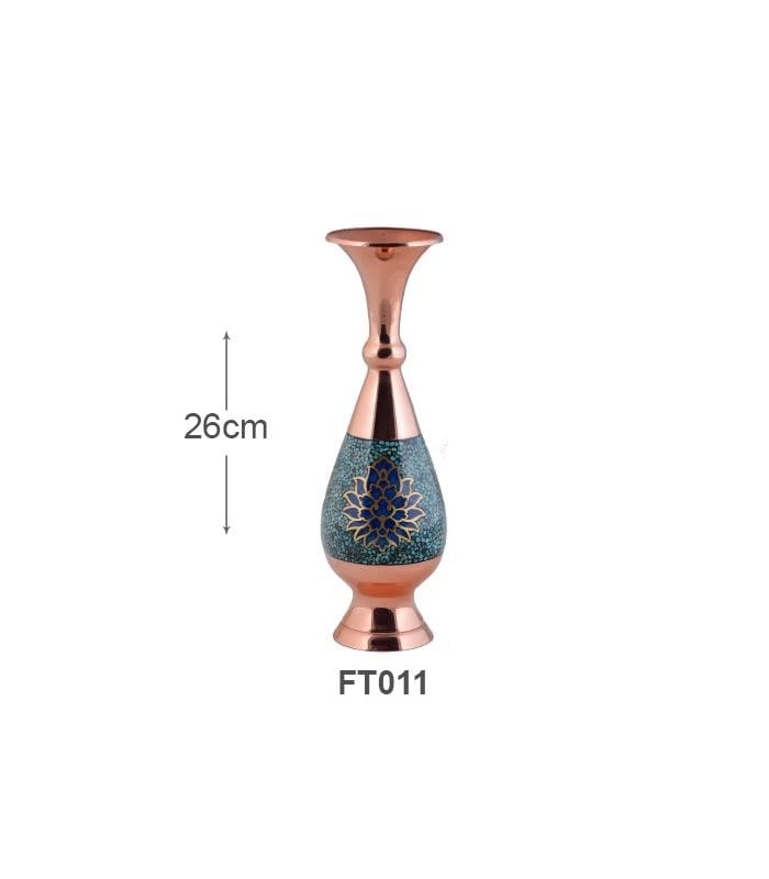گلدان صراحی فیروزه کوبی تولید صنایع دستی آقاجانی از بهترین و با کیفیت ترین فیروزه نیشابور و توسط بهترین هنرمندان شاغل در صنایع دستی اصفهان ساخته شده است. این گلدان 25 سانتی متر ارتفاع دارد و جنس لایه ی داخلی آن از مس است. از نکات قابل توجه در این گلدان فیروزه کوب آقاجانی گارانتی 10 ساله ی محصول و نشان استاندارد ملی ایران است که این محصول را از نمونه های مشابه کاملا متمایز می کند. گلدان صراحی فیروزه کوبی آقاجانی نمونه ای کم نظیر از زیبایی هنر ایرانی است.